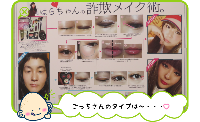 これもまたすごいインパクト!ごっちさんもうっかり浮かれてしまいそうな見事なメイク。バニラボックスさんからは、「はらさんとディズニーランドに行ったら、サングラスをしていたのに髪型でバレた」そうですよ。