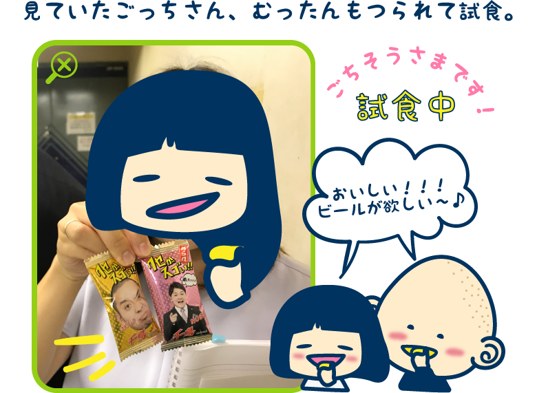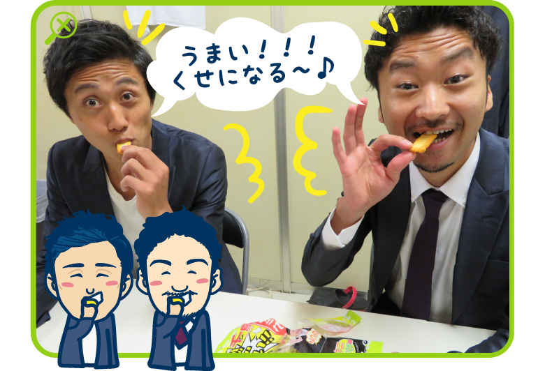 ここで、広報担当の中村さんの粋な計らいをいただき、バニラボックスのお二人に人気1位「千鳥 クセがすごいあられ」で食レポを実施!