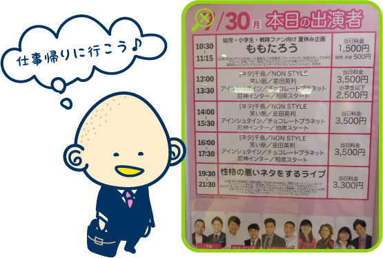 女装ライブやほっこりライブ等しばりライブもあります。若手芸人さんだけでなく、間寛平さん等兄さんたちのライブもあります!