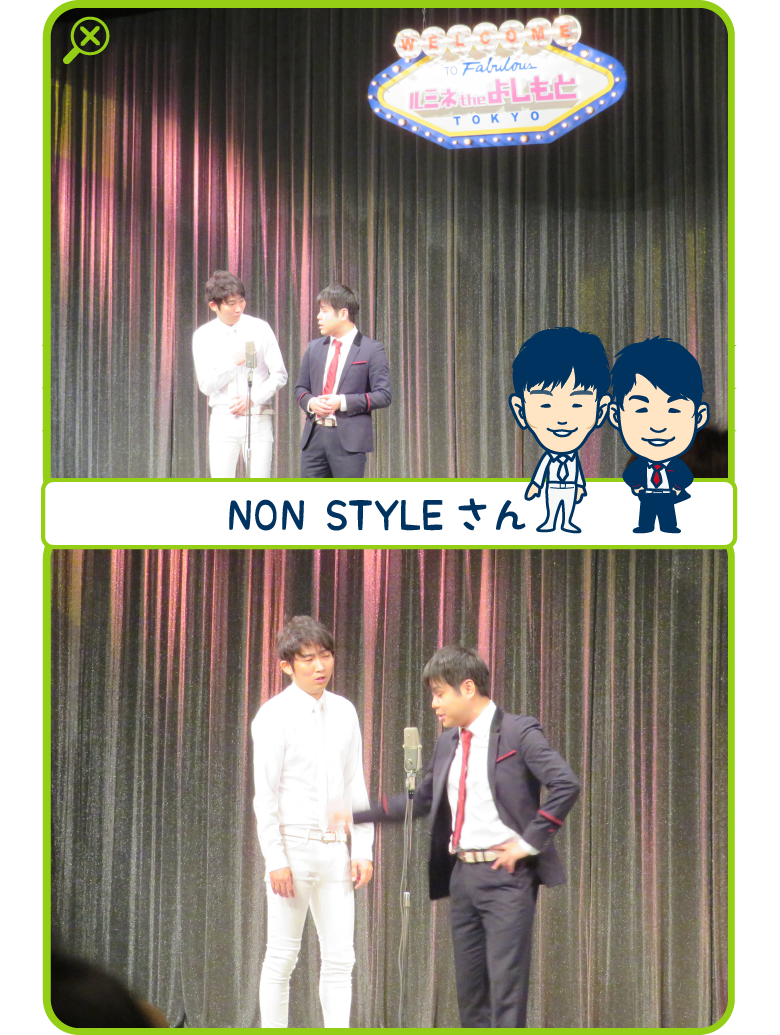 そして、舞台が上がり直前までインタビューに対応していただいたNON STYLEさんから登場!先ほどまでとはまた違ったいつもテレビで見るアノお二人です。