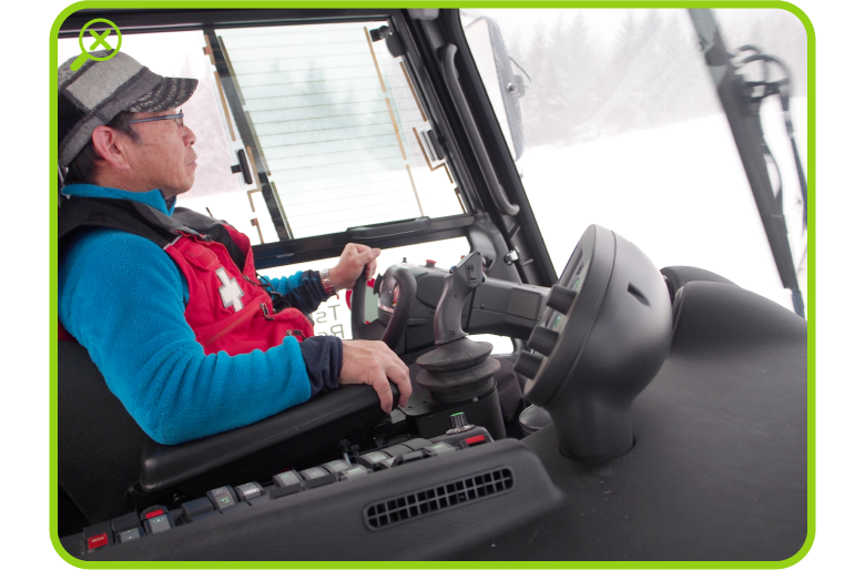 降雪しているときはコースが見えにくく作業が難しいが、経験と他の圧雪車との連携で営業開始までに全コースを万全な状態に仕上げているんだそう。