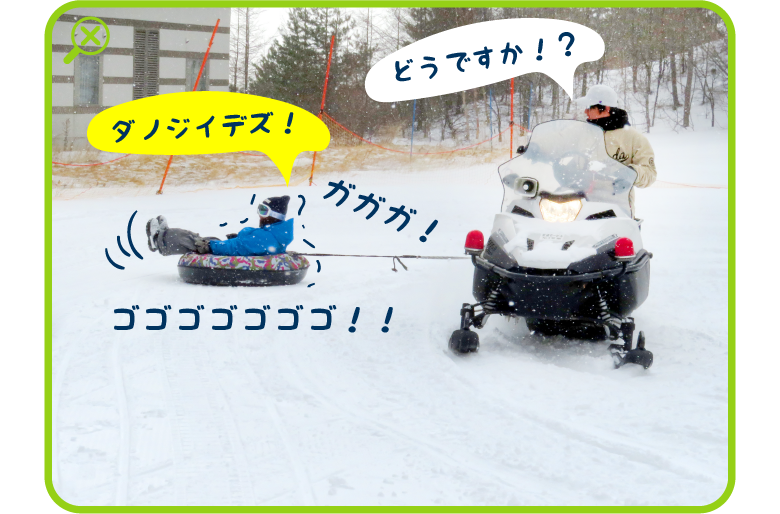 大きめの車体のスノーモービルにチュービングを繋いで1人乗りのスノーラフティングが体験できます。