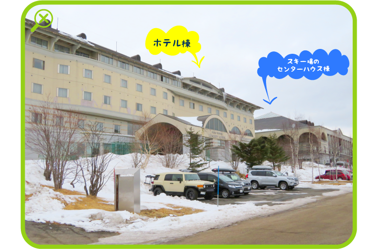 パルコールつま恋スキーリゾート&ホテルは駐車場から見て左側がホテル棟、右側がスキー場のセンターハウス棟になっています。